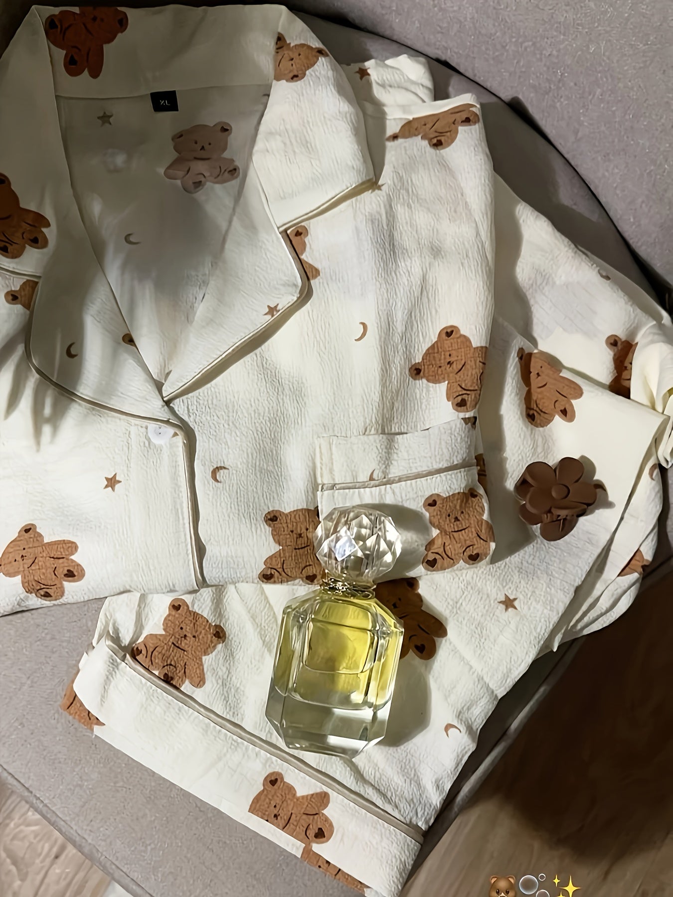 1set Cute Cartoon Bear Print Long Sleeve Pajama Set for Women - Polyester Lapel Collar Patterned Sleepwear, Woven All-Season Loungewear