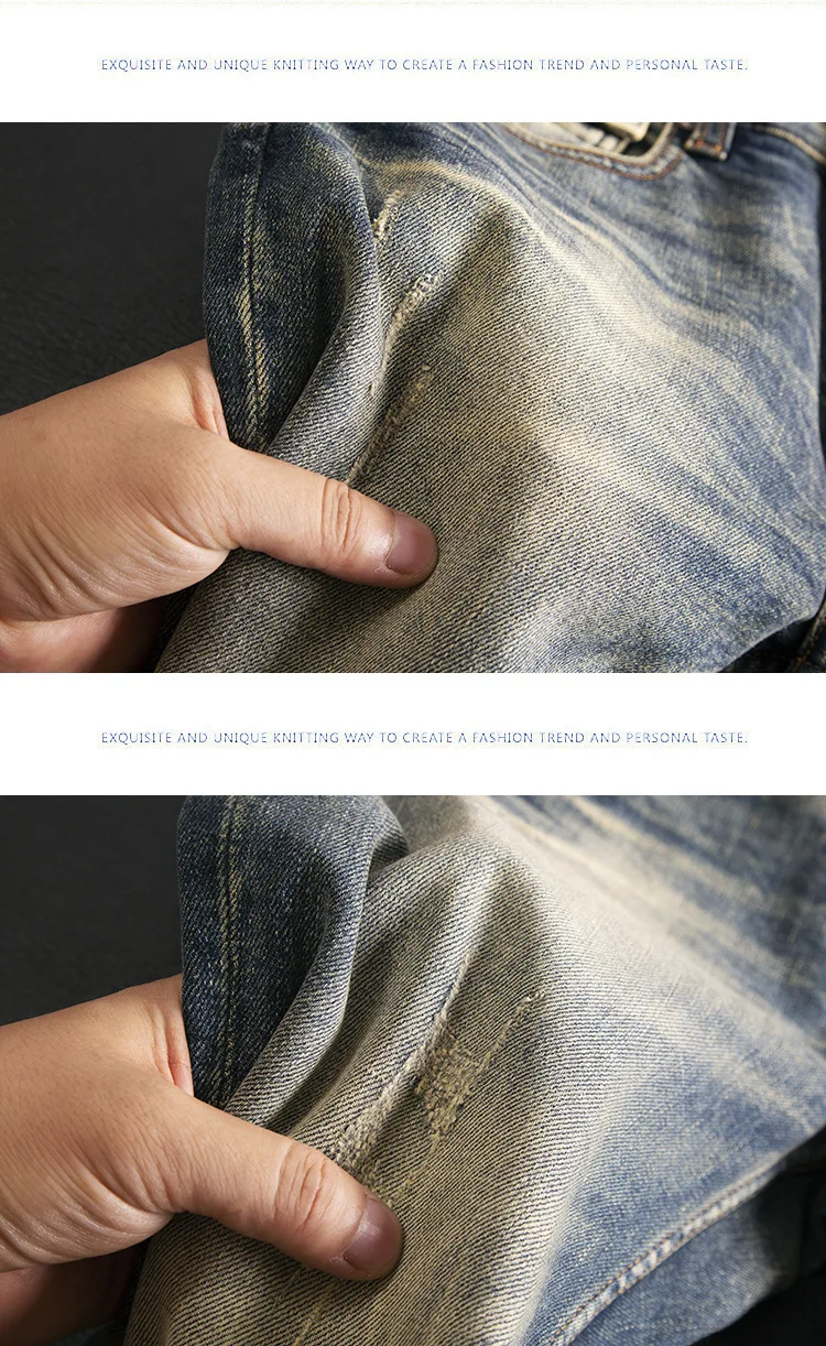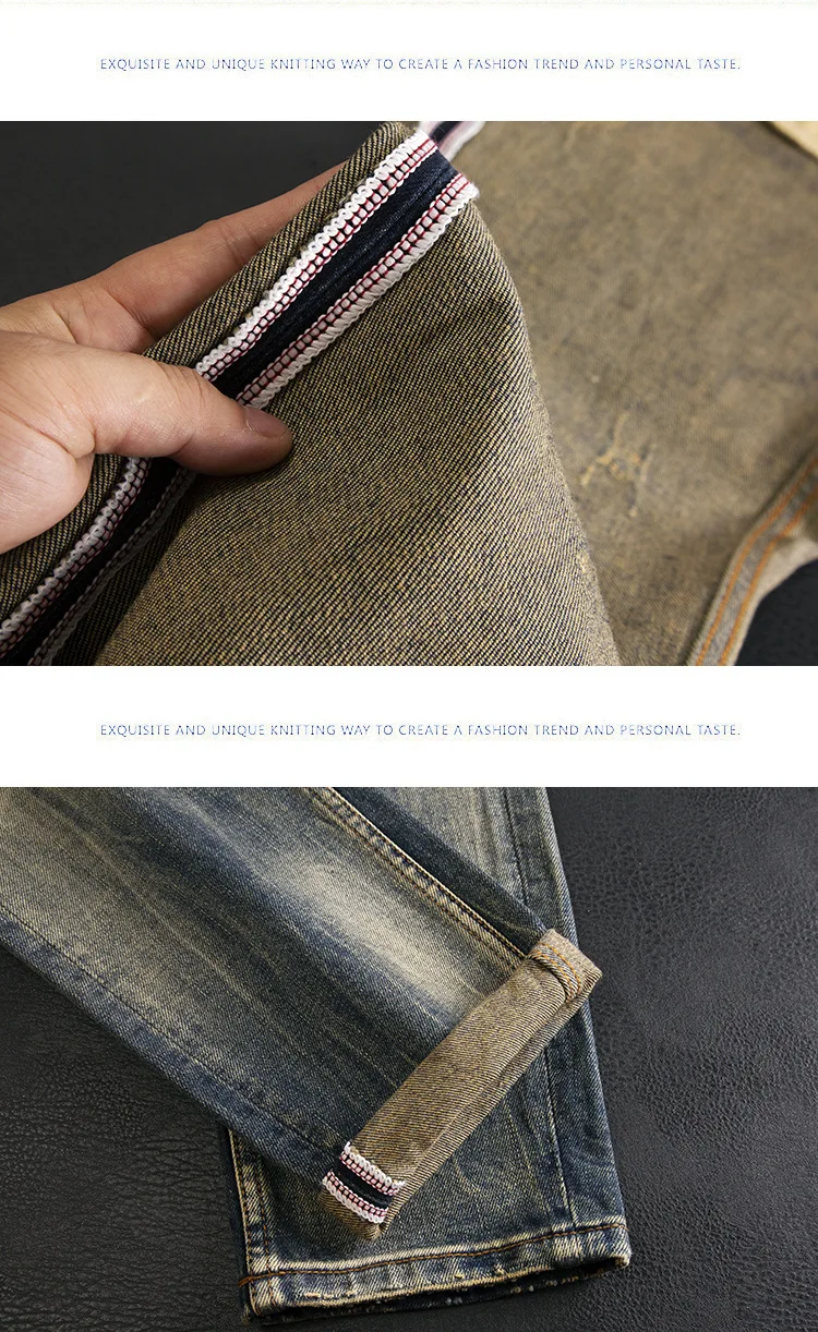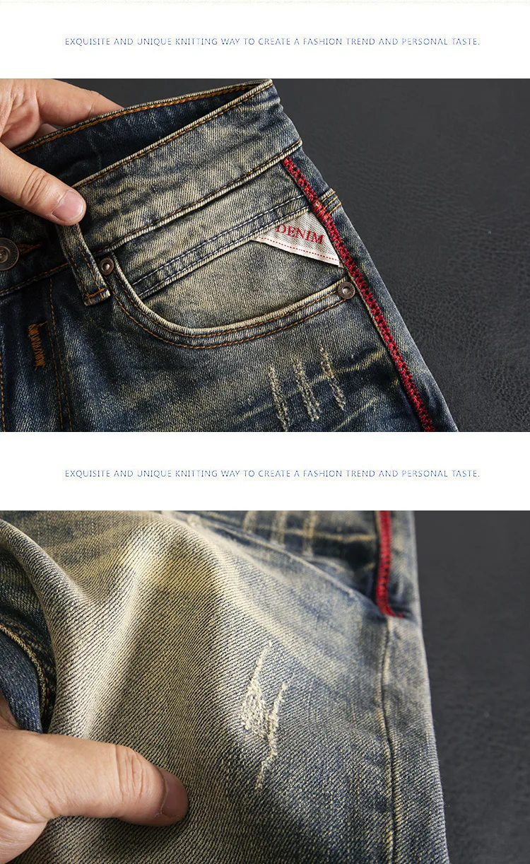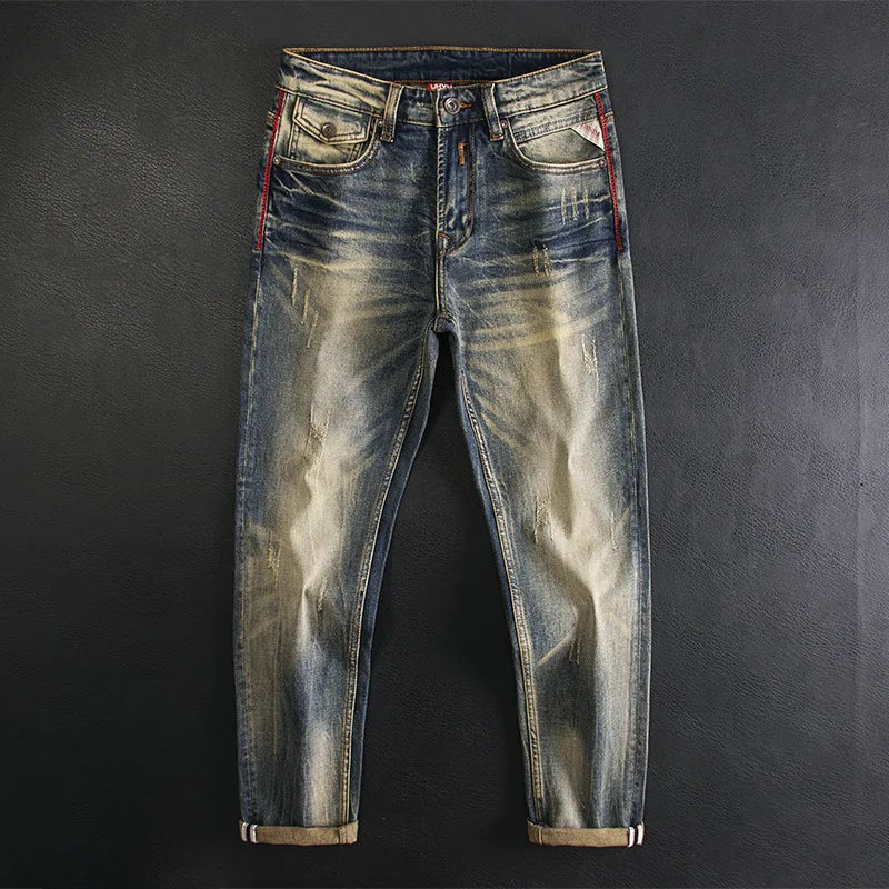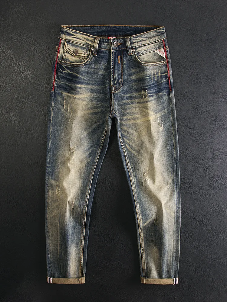 High end jeans for men, American retro nostalgic washed slim fit, small straight tube elastic autumn and winter trendy pants