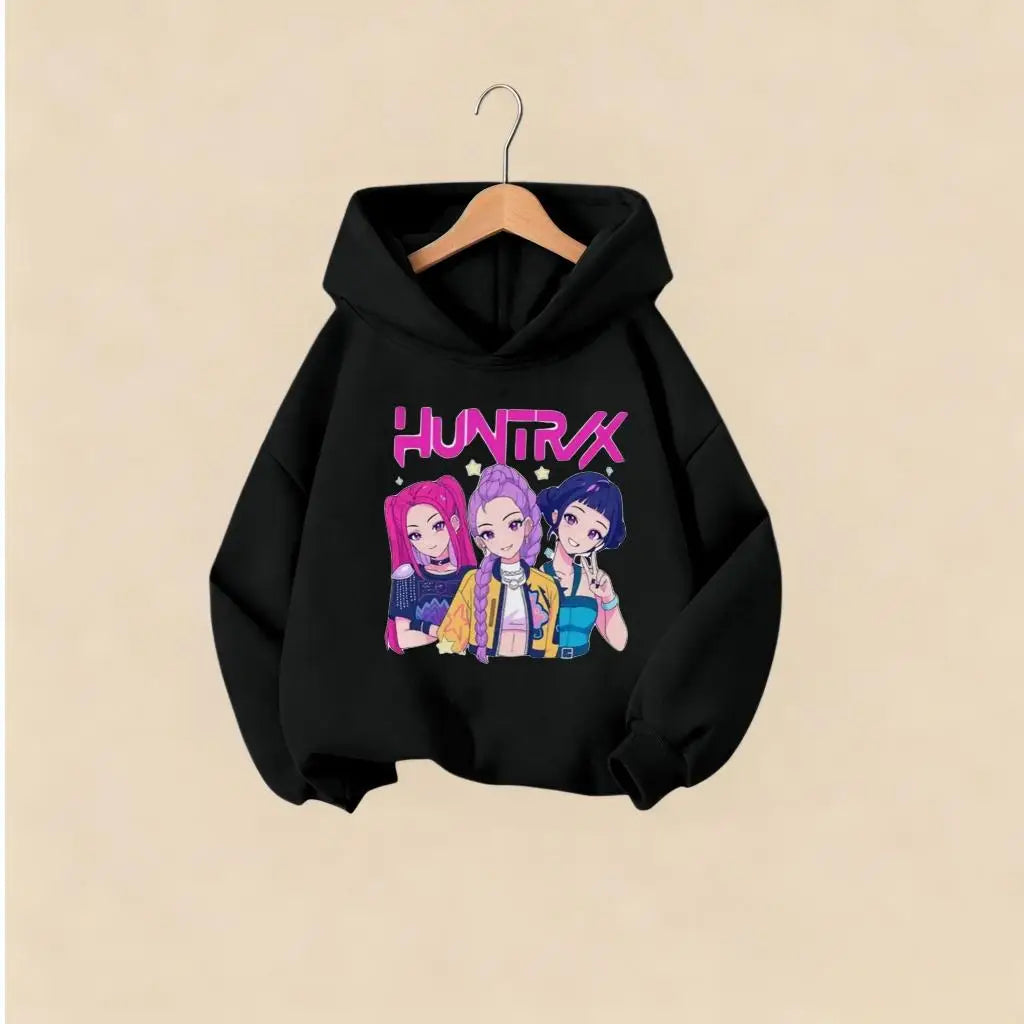 Let your kids show their love for KPOP Hunters with this adorable Huntrix girl fashion hoodie. Featuring cute character prints with stars and a casual hooded design, this sweatshirt is perfect for boys and girls who want to dress up as their favorite characters.