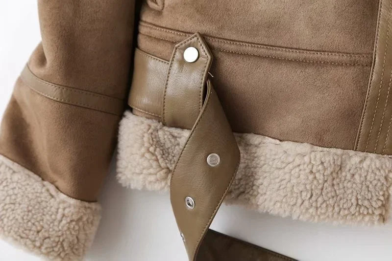 Faux Shearling Sheepskin Leather Jackets Lady Thick Warm Suede Lambs Motorcycle Brown Coats Mujer Chaqueta
