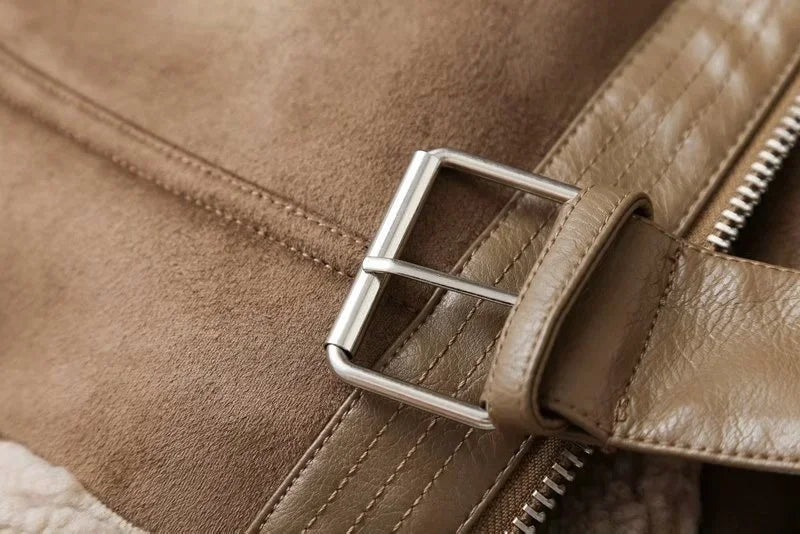 This versatile jacket is your perfect companion for winter days when you need maximum warmth without sacrificing style. The faux shearling provides exceptional insulation and softness, while the motorcycle-inspired design adds an edgy, fashion-forward vibe. The thick suede construction ensures durability and warmth, while the lamb details add extra plush comfort. The brown color is sophisticated and versatile, working beautifully with any outfit. Perfect for pairing with jeans and boots for classic biker style, or layer over a dress for an unexpected contrast. This is the kind of practical yet stylish piece that becomes a winter essential.